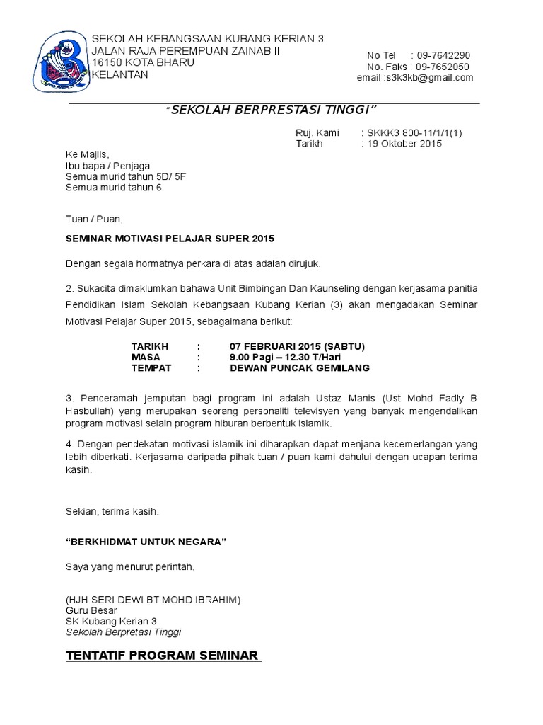 Contoh Surat Jemputan Ibu Bapa Ke Program Sekolah Pdf